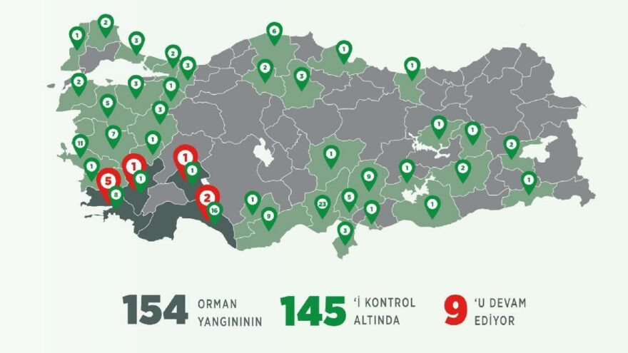 Bu yangınlardan 145’i kontrol altına alındı. 4 ildeki 9 yangına ise müdahale devam ediyor. Ayrıca, 91 kırsal alan yangınına müdahale edildi.