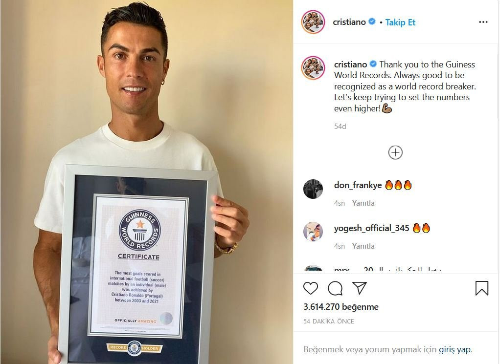 Guiness Rekorlar Kitabı’ndan sertifikası da gelen Ronaldo, “Guinness Rekorlar Kitabı’na teşekkürler. Dünya rekoru kıran biri olarak tanınmak her zaman iyidir. Rakamları daha da yükseltmeye çalışalım” ifadelerini kullandı.