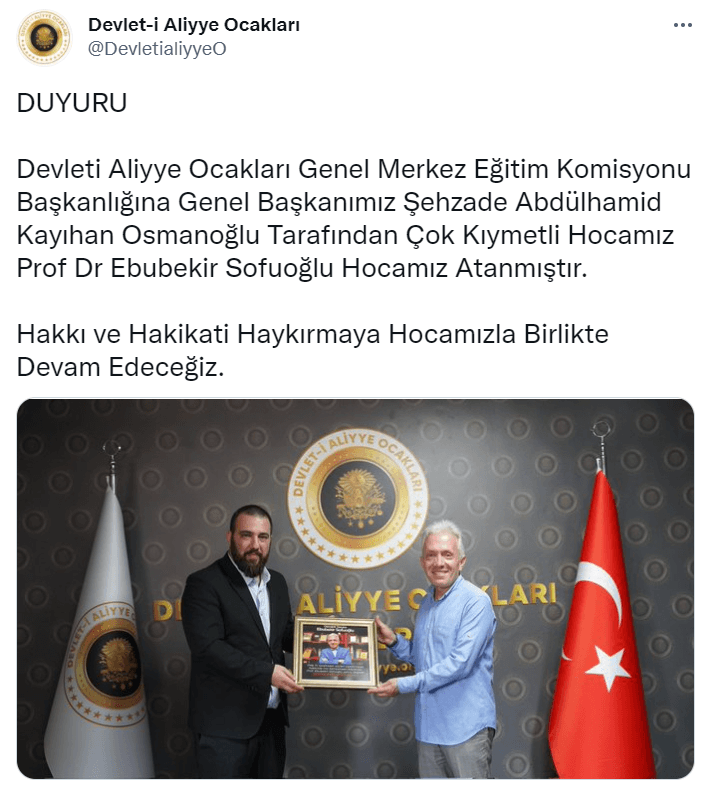 “Devleti Aliyye Ocakları Genel Merkez Eğitim Komisyonu Başkanlığına Genel Başkanımız Şehzade Abdülhamid Kayıhan Osmanoğlu Tarafından Çok Kıymetli Hocamız Prof Dr Ebubekir Sofuoğlu Hocamız Atanmıştır. Hakkı ve Hakikati Haykırmaya Hocamızla Birlikte Devam Edeceğiz.”