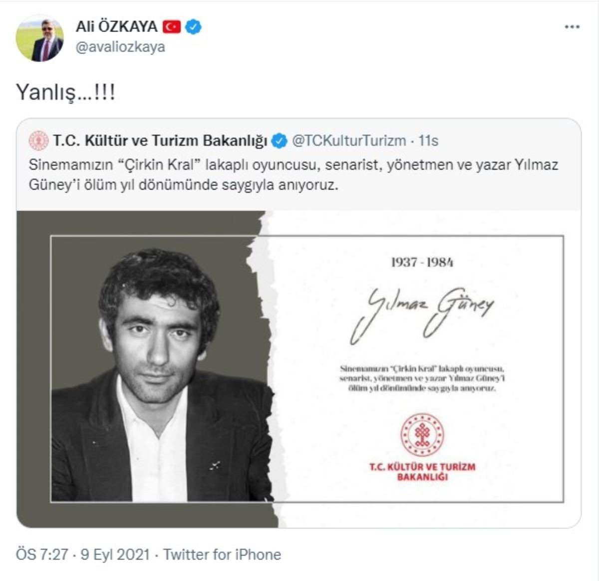 Sözcü Gazetesi’nin haberine göre AKP Afyonkarahisar Milletvekili Ali Özkaya, Türk sinemasının ‘Çirkin Kral’ lakaplı sanatçısı, oyuncu, yönetmen, senarist ve yazar Yılmaz Güney’i ölüm yıl dönümünde anan Kültür ve Turizm Bakanlığı’na sosyal medyadan tepki gösterdi.