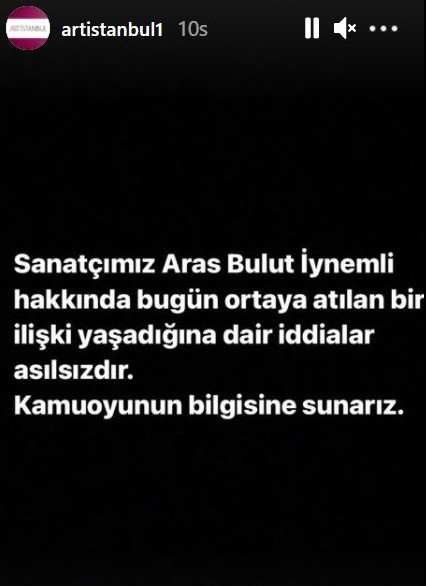 Bu iddiaların ardından İynemli’nin menajerlik şirketi yaptığı açıklamada, “Sanatçımız Aras Bulut İynemli hakkında bugün ortaya atılan bir ilişki yaşadığına dair iddialar asılsızdır. Kamuoyunun bilgisine sunarız” ifadelerini kullandı.