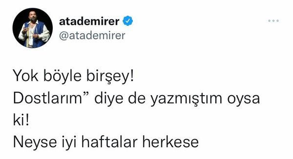 Ata Demirer, önceki gün Twitter üzerinden konuyla ilgili açıklama yaptı. Ata Demirer, “Yok böyle bir şey! ‘Dostlarım…’ diye de yazmıştım oysa ki! Neyse iyi haftalar herkese.” ifadelerini kullanarak, aşk iddialarına son noktayı koydu.