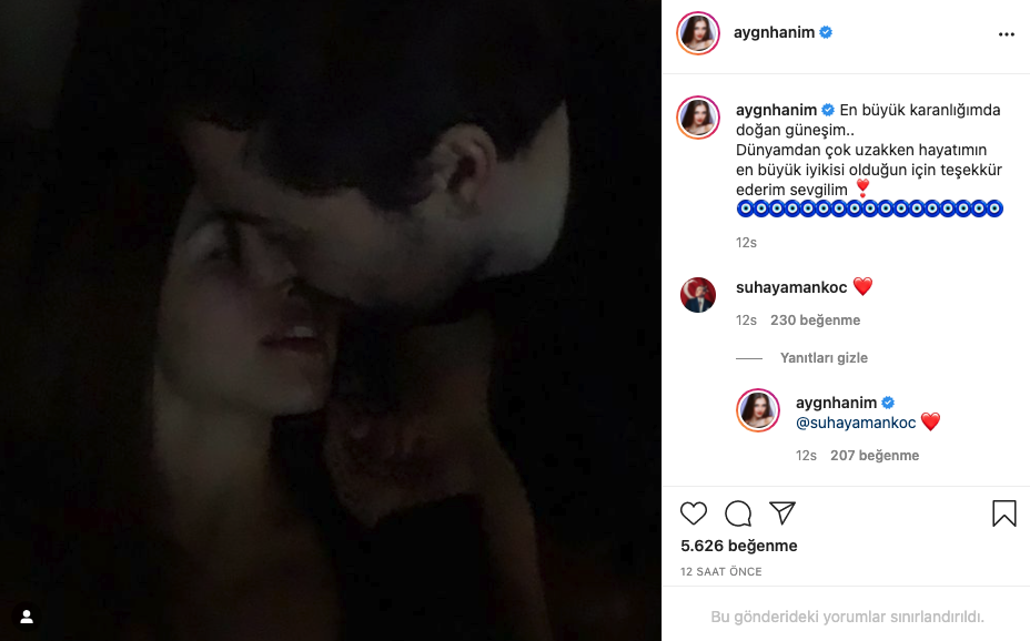 Aygün Aydın, yeni sevgilisi Süha Yaman Koç’la öpüşürken çekilmiş karesini kalp ve nazar boncuğu emojisi koyarak paylaştı ve altına şunları yazdı: