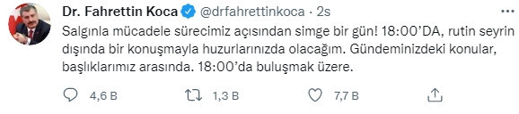 “Salgınla mücadele sürecimiz açısından simge bir gün! 18:00’de, rutin seyrin dışında bir konuşmayla huzurlarınızda olacağım. Gündeminizdeki konular, başlıklarımız arasında. 18:00’de buluşmak üzere.”