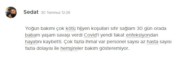 İşte; babasının enfeksiyondan öldüğünü iddia eden Sedat, isimli kullanıcı ve bir çok hasta mağdurlarının şikayetvar.com sitesine yaptıkları ve Sağlık Bakanlığı’nı harekete geçirecek akıl almaz şikayetler…