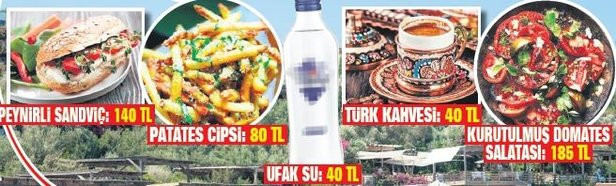 Tavuk salatası 210 TL, ufak su 40 TL, 1 porsiyon patates cipsi 80 TL, Türk kahvesi ise 40 TL’den satıldı.