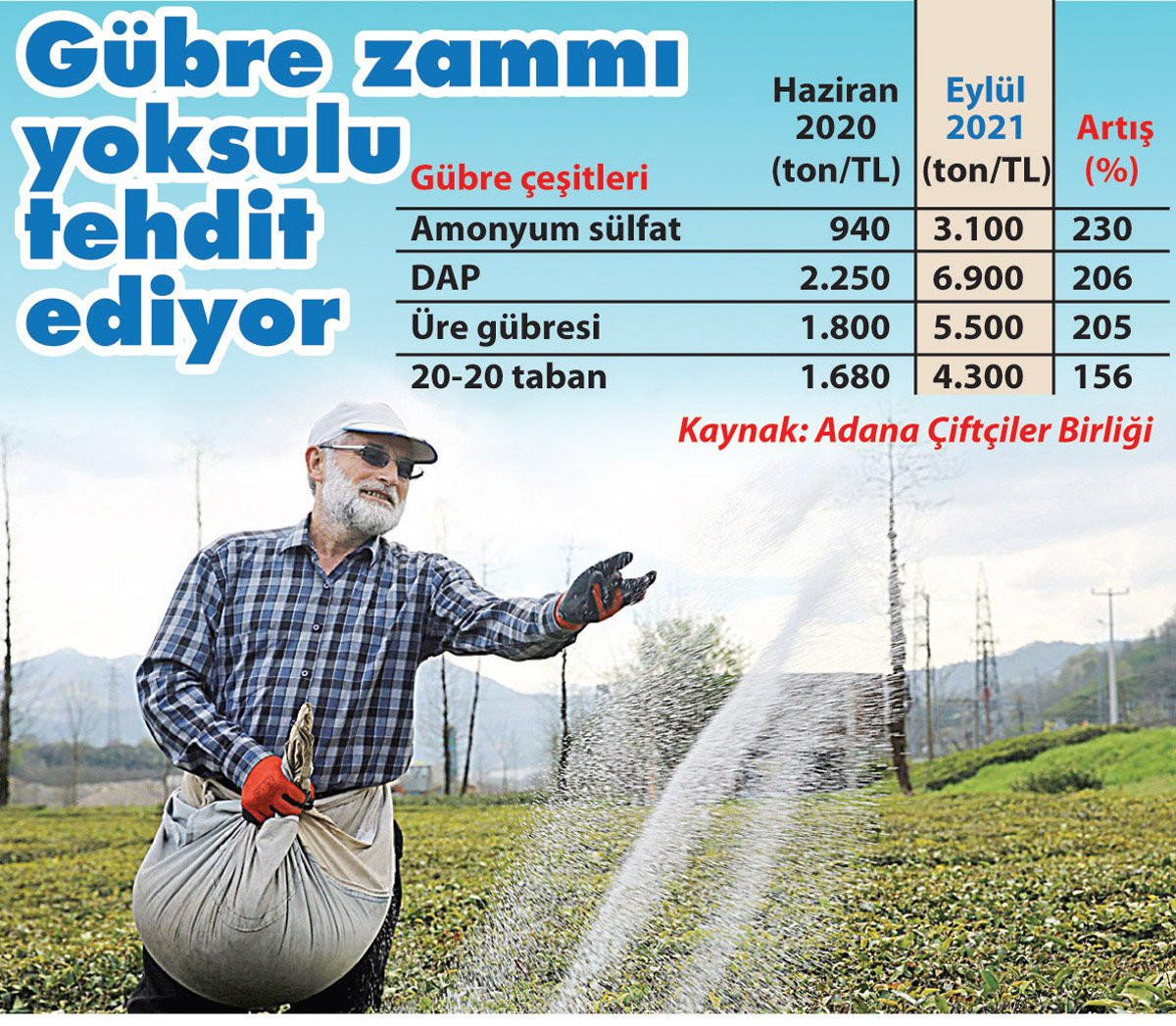 Çiftçinin tarımsal üretimde kullandığı en önemli girdiler arasında yer alan amonyum sülfat gübrenin tonu geçen yıl haziran ayında 940 liraydı. Bugün aynı gübre 3 bin 100 liradan satılıyor. Artış oranı yüzde 230. DAP gübresi aynı dönemde yüzde 206 zamla 2 bin 250 liradan 6 bin 900 liraya, üre gübresi bin 800 liradan 5 bin 500 liraya, 20-20 taban gübresi bin 680 liradan 4 bin 300 liraya fırladı.