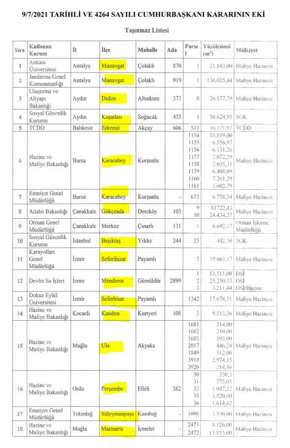 Ekli listede yer alan taşınmazların ve üzerlerinde bulunan yapıların (varlıkların);