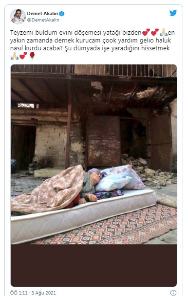 Twitter hesabından paylaşımda bulunan şarkıcı, “Teyzemi buldum. Evini döşemesi, yatağı bizden… “ ifadelerini kullandı. En yakın zamanda yardım derneği kuracağını da belirten Akalın, “Çok yardım geliyor. Haluk (Levent) nasıl kurdu acaba? Şu dünyada işe yaradığını hissetmek…” şeklinde konuştu.