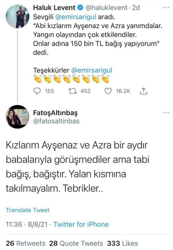 Levent, “Sevgili Emir Sarıgül aradı. ‘Abi kızlarım Ayşenaz ve Azra yanımdalar. Yangın olayından çok etkilendiler. Onlar adına 150 bin TL bağış yapıyorum’ dedi.”
