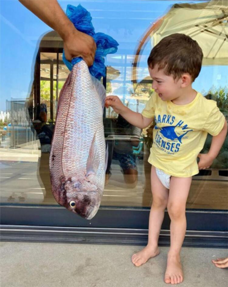 Burak Özçivit, tuttuğu balığı oğlu Karan’a gösterdi. İki yaşındaki Karan’ın, gördüğü balık karşısında heyecanı objektife böyle yansıdı.