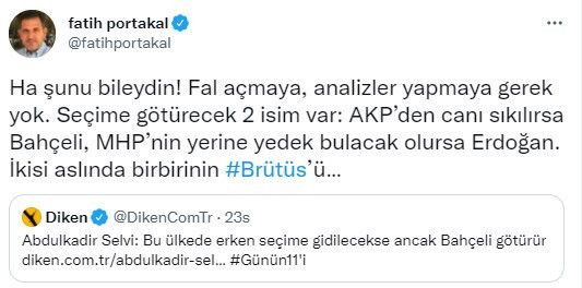 Portakal, mesajında “Ha şunu bileydin! Fal açmaya, analizler yapmaya gerek yok. Seçime götürecek 2 isim var: AKP’den canı sıkılırsa Bahçeli, MHP’nin yerine yedek bulacak olursa Erdoğan. İkisi aslında birbirinin #Brütüs’ü…” ifadelerine yer verdi.