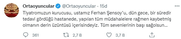 Açıklamada, “Tiyatromuzun kurucusu, ustamız Ferhan Şensoy’u, dün gece, bir süredir tedavi gördüğü hastanede, yapılan tüm müdahalelere rağmen kaybetmiş olmanın derin üzüntüsü içerisindeyiz. Tüm sevenlerinin başı sağolsun…” denildi.