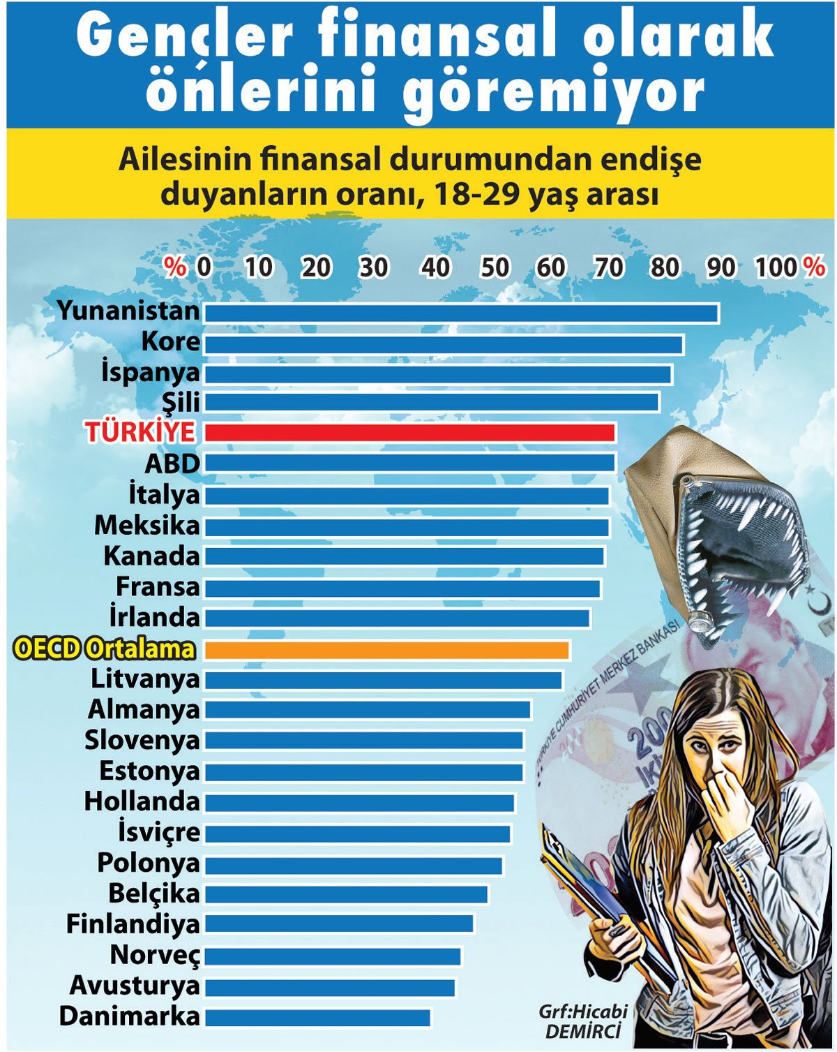 Sözcü Gazetesi’nden Özlem Ermiş Beyhan’ın haberine göre Ekonomik İşbirliği ve Kalkınma Teşkilatı’nın (OECD) son araştırması Türkiye’de gençlerin yüzde 70’inin ekonomik endişe içinde olduğunu ortaya koydu. Araştırmada gençlerin en çok ekonomik sorun yaşadığı ülkeler ise şöyle sıralandı: Şili, Meksika, Slovenya ve Türkiye. Araştırmada gençlere “Ailenizin ve kendinizin ekonomik durumuna dair az veya çok endişeniz var mı?” diye soruldu.