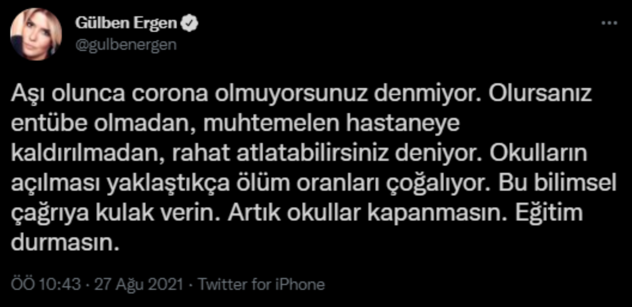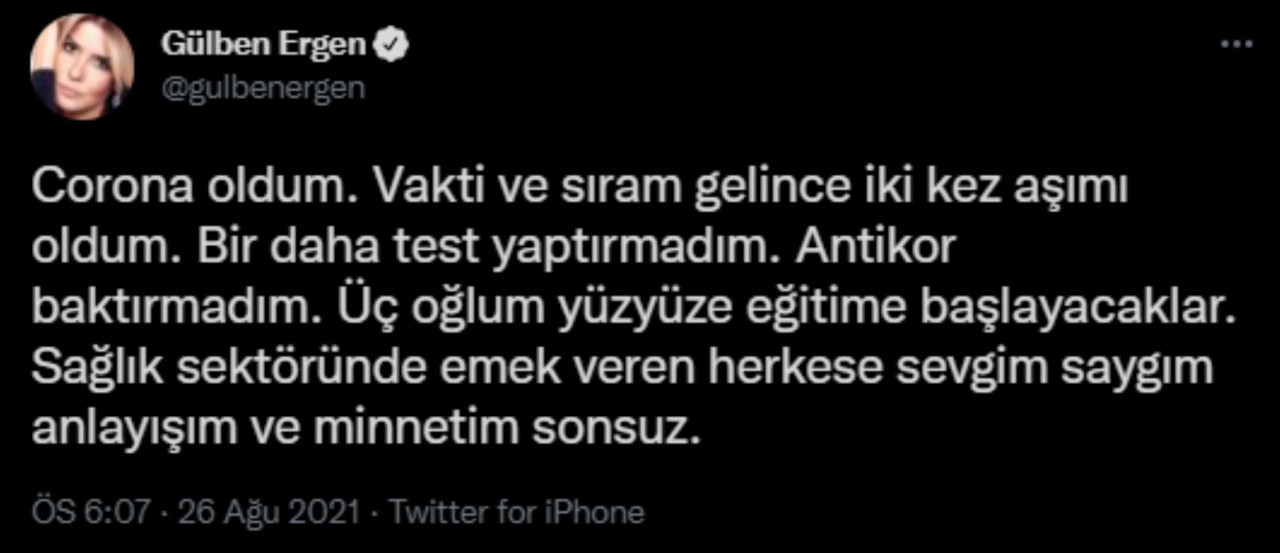 Ünlü sanatçı Gülben Ergen, Twitter hesabından “Corona oldum. Vakti ve sıram gelince iki kez aşımı oldum. Bir daha test yaptırmadım. Antikor baktırmadım. Üç oğlum yüzyüze eğitime başlayacaklar. Sağlık sektöründe emek veren herkese sevgim, saygım, anlayışım ve minnetim sonsuz.” dedi.