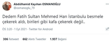Sözcü Gazetesi’nden Müslüm Evci’nin haberine göre Osmanoğlu paylaşımında, “Dedem Fatih Sultan Mehmed Han İstanbul’u besmele çekerek aldı, birileri gibi kafa çekerek değil” ifadelerine yer verdi.