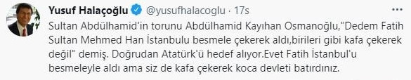 Osmanoğlu’nun Atatürk’ü hedef alan çirkin paylaşımına Türk Tarih Kurumu Eski Başkanı ve Kayseri eski milletvekili Yusuf Halaçoğlu yanıt verdi.