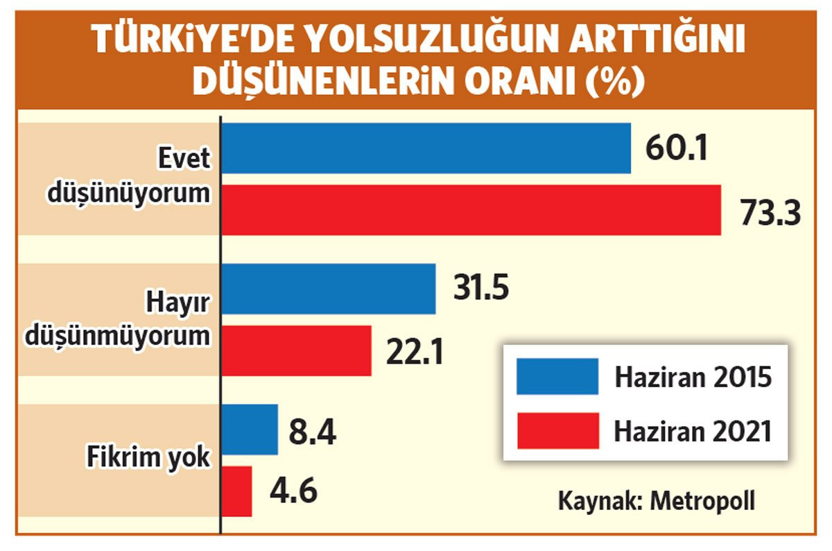 Sözcü Gazetesi’nden Sayime Başçı’nın haberine göre ekonomik kriz, işsizlik ve art arda gelen doğal afetlerle sınanan halk, son 1 yılda yolsuzlukta büyük artış yaşandığına inanırken, toplumun yolsuzluk algısı parti ayırt etmeksizin zirveye ulaştı. Vatandaşların yüzde 73.3’ü son 1 yıl içinde Türkiye’de yolsuzluğun arttığına inanırken, yüzde 22.1’i ise böyle bir artış olduğunu düşünmediğini açıkladı. Metropoll tarafından yapılan Haziran 2021 Türkiye’nin Nabzı araştırmasının sonuçlarına göre, Haziran 2015’te toplumda, yolsuzlukta artış olduğuna inan yüzde 60’lık kesimin oranı, son 6 yılda yaşanan gelişmelerle birlikte 13 puan artarak yüzde 73.3’e kadar çıktı. Her 7 kişiden 1’inin ‘yolsuzluk var’ dediği Türkiye’de AKP’ye oy verdiğini açıklayan seçmenlerin de yarısı yolsuzluktaki artışa işaret etti. CHP’li seçmenlerin yüzde 95’i, İyi Partili seçmenlerin yüzde 94.1’i, MHP’li seçmenlerin yüzde 71.9’u da yolsuzlukta büyük bir artışın yaşandığını düşünüyor.