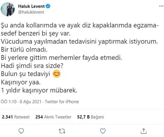 Twitter hesabından egzama-sedef hastalığına çare bulunması çağrısında bulunan Levent, paylaşımında şu ifadelere yer verdi: