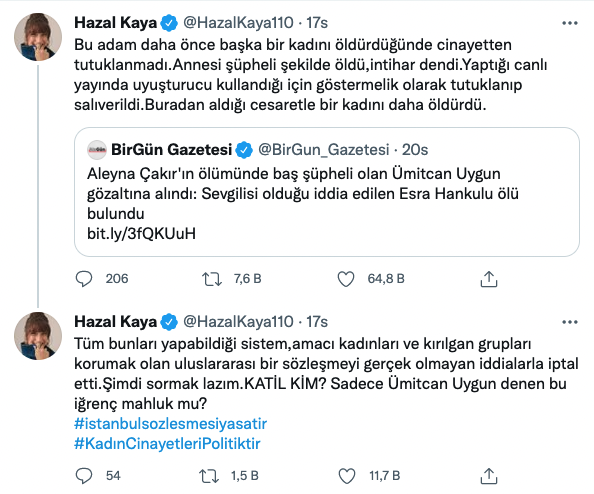 Tüm bunları yapabildiği sistem, amacı kadınları ve kırılgan grupları korumak olan uluslararası bir sözleşmeyi gerçek olmayan iddialarla iptal etti. Şimdi sormak lazım. KATİL KİM? Sadece Ümitcan Uygun denen bu iğrenç mahluk mu?”