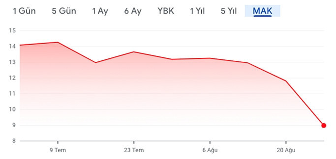 1 Temmuz ile 25 Ağustos tarihleri arasında 12-14 dolar arasında seyreden şirketin hisse fiyatı geçen hafta perşembe günü (26 Ağustos), bir günde yüzde 25’ten fazla değer kaybederek, 12 dolardan 8 dolar seviyesine kadar inmişti.