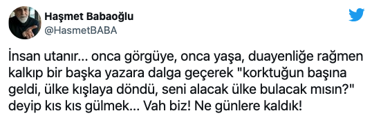 “İnsan utanır…” diye söze başlayan Babaoğlu, “Onca görgüye, onca yaşa, duayenliğe rağmen kalkıp bir başka yazara dalga geçerek ‘Korktuğun başına geldi, ülke kışlaya döndü, seni alacak ülke bulacak mısın?’ deyip kıs kıs gülmek… Vah biz! Ne günlere kaldık!” ifadelerini kullandı.