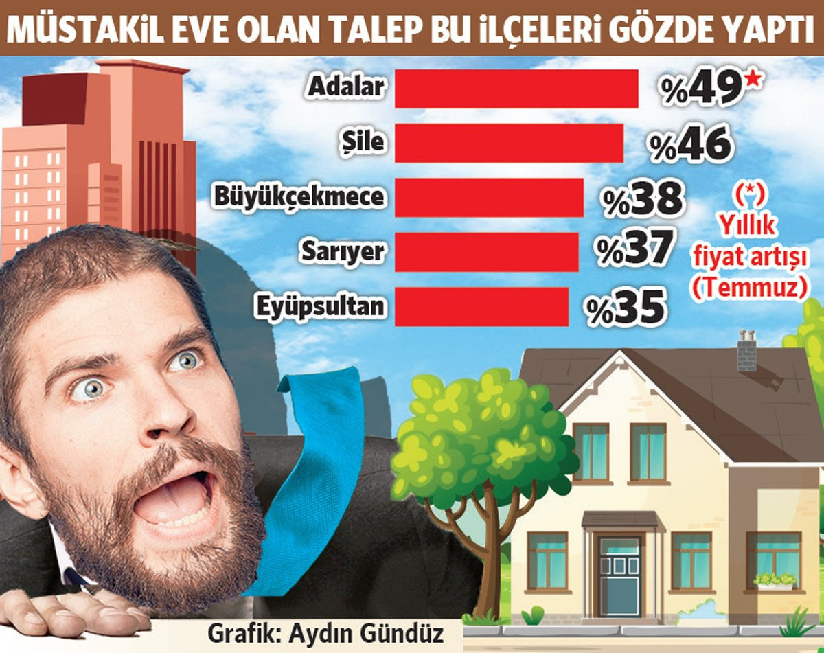 Sözcü Gazetesi’nden Nuray Tarhan’ın haberine göre salgında diğer insanlardan izole olma ihtiyacıyla birlikte yükselen müstakil ev sahibi olma talebi İstanbul’daki bazı ilçelerde villa fiyatlarını uçurdu. Temmuz ayı itibarıyla son bir yılda müstakil ev sayısının yoğun olduğu ilçelerde konut fiyatları neredeyse yüzde 50 artış gösterdi. Fiyat artışında Adalar yüzde 49’la ilk sırada gelirken, onu yüzde 46 ile Şile, yüzde 38 ile Büyükçekmece, yüzde 37 ile Sarıyer, yüzde 35 ile Eyüpsultan izledi.