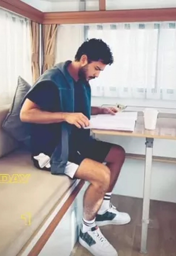 Dizinin başrol oyuncularından Kaan Yıldırım, sette karavanda senaryo okurken bir karesini sosyal medya hesabından paylaştı.