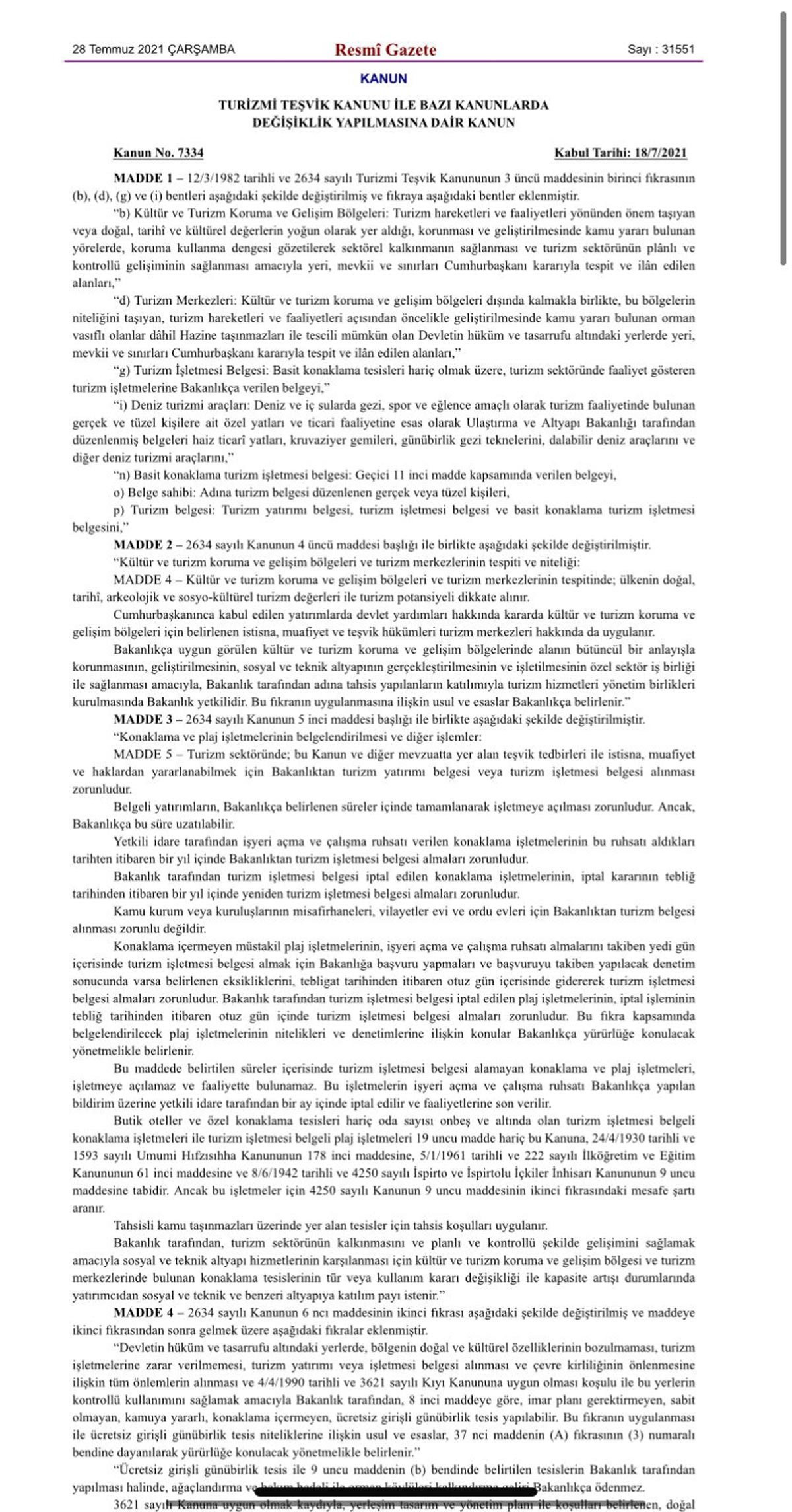 7334 sayılı Turizmi Teşvik Kanunu’nda değişiklik yapan yasa, tam da orman yangınlarının başladığı 28 Temmuz 2021’de Resmî Gazetede yayınlanarak yürürlüğe girdi. Kanunun 1’inci maddesi “d” fıkrasına göre “Kültür ve Turizm gelişme bölgeleri dışında kalsa bile” orman arazileri “kamu yararı” kapsamına alınarak turizm yatırımcılarına açılabilecek.