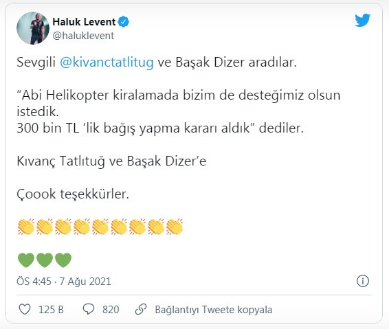 Levent, Twitter hesabından, “Sevgili Kıvanç Tatlıtuğ ve Başak Dizer aradılar. ‘Abi helikopter kiralamada bizim de desteğimiz olsun istedik. 300 bin TL‘lik bağış yapma kararı aldık.’ dediler. Kıvanç Tatlıtuğ ve Başak Dizer’e çok teşekkürler.” mesajını paylaştı.