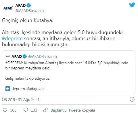 AFAD’dan yapılan açıklamada “Geçmiş olsun Kütahya. Altıntaş ilçesinde meydana gelen 5,0 büyüklüğündeki deprem sonrası, an itibarıyla, olumsuz bir ihbarın bulunmadığı bilgisi alınmıştır” denildi.