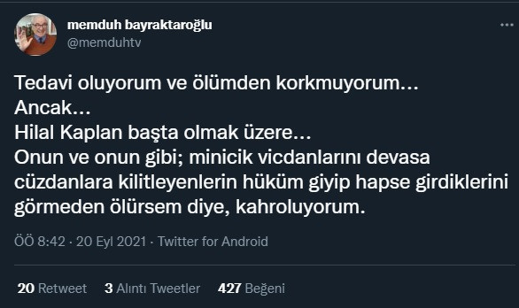 “Tedavi oluyorum ve ölümden korkmuyorum… Ancak… Hilal Kaplan başta olmak üzere… Onun ve onun gibi; minicik vicdanlarını devasa cüzdanlara kilitleyenlerin hüküm giyip hapse girdiklerini görmeden ölürsem diye, kahroluyorum.”