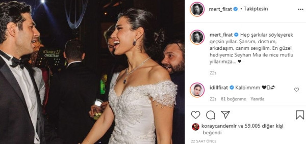 “Evladımız pandeminin bize hediyesi oldu.” diyen çift, üçüncü evlilik yıl dönümlerini kutladı. Ünlü oyuncu, düğünden fotoğrafı, “Hep şarkılar söyleyerek geçsin yıllar… Şansım, dostum, arkadaşım, canım sevgilim… En güzel hediyemiz Seyhan Mia ile nice mutlu yıllarımıza…” notuyla Instagram hesabından paylaştı.