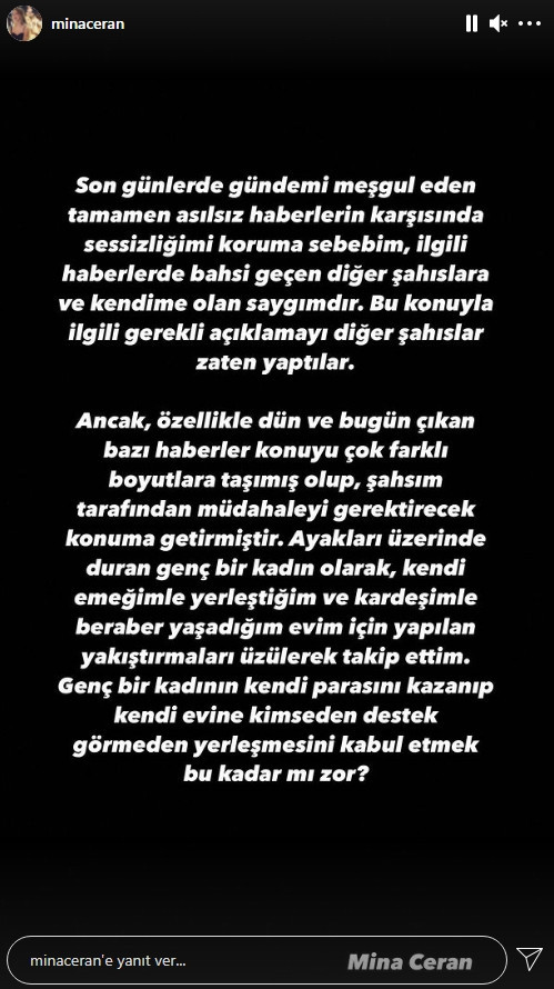 İddiaları yalanlayan Mina Ceran, “Son günlerde gündemi meşgul eden tamamen asılsız haberlerin karşısında sessizliğimi koruma sebebim; ilgili haberlerde bahsi geçen diğer şahıslara ve kendime olan saygımdandır. Bu konuyla ilgili gerekli açıklamayı diğer şahıslar zaten yaptılar… Ancak özellikle dün ve bugün çıkan bazı haberler konuyu çok farklı boyutlara taşımış olup, şahsım tarafından müdahaleyi gerektirecek konuma getirmiştir. Ayakları üzerinde duran genç bir kadın olarak, kendi emeğimle yerleştirdiğim ve kardeşimle beraber yaşadığım evim için yapılan yakıştırmaları üzülerek takip ettim. Genç bir kadının kendi parasını kazanıp, kendi evine kimseden destek görmeden yerleşmesini kabul etmek bu kadar mı zor?” ifadelerini kullandı.