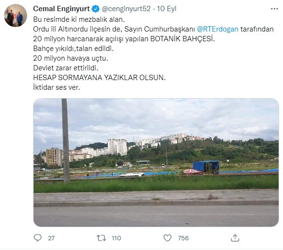 20 milyon liraya mal olan bahçenin fotoğrafını paylaşan Demokrat Parti Ordu Milletvekili Cemal Enginyurt, “Bu resimdeki mezbalık alan. Cumhurbaşkanı Erdoğan tarafından açılışı yapılan Botanik Bahçesi. Bahçe yıkıldı, talan edildi. Halkın 20 milyon lirası da havaya uçtu. Hesap sormayana yazıklar olsun. İktidar ses ver” diyerek tepki gösterdi.