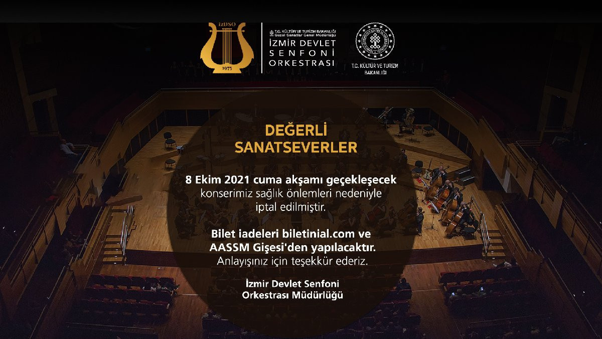 İzmir Devlet Senfoni Orkestrası’ndan yapılan açıklamada, “8 Ekim 2021 Cuma akşamı gerçekleşecek konserimiz sağlık önlemleri nedeniyle iptal edilmiştir” denildi.