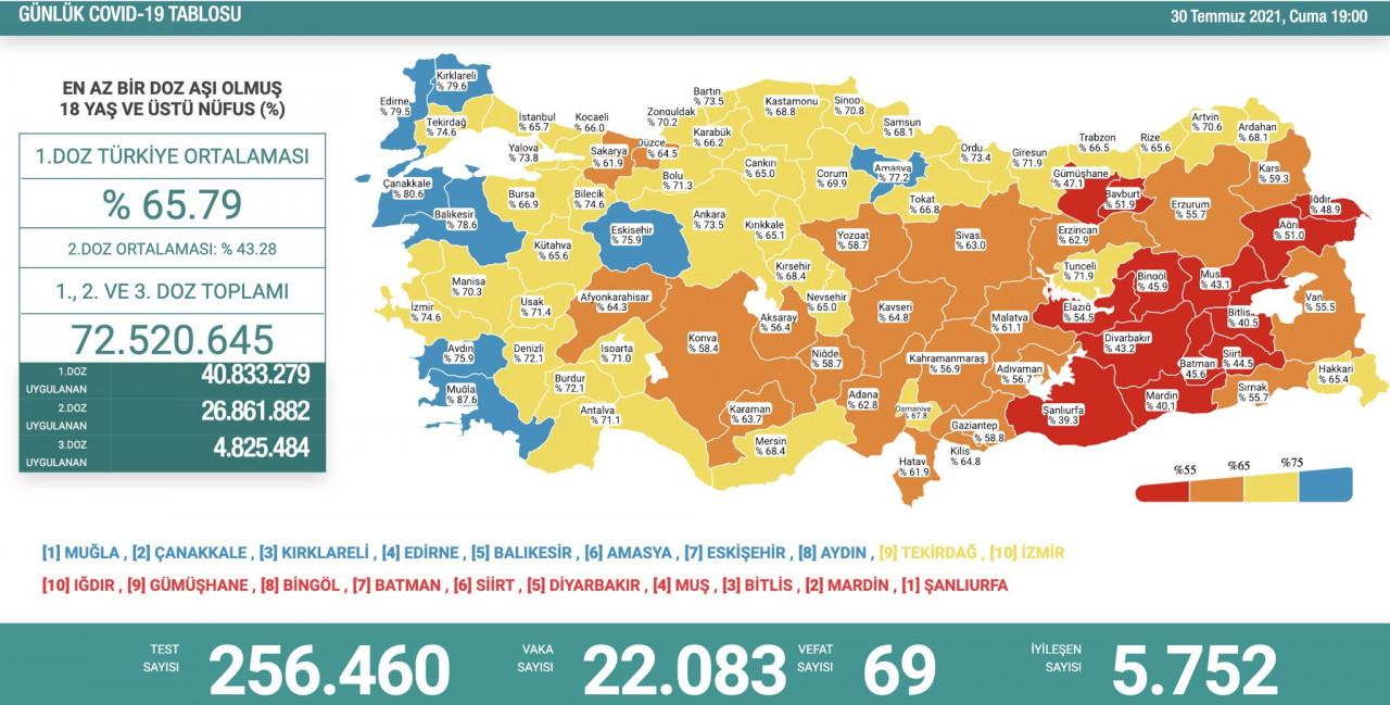 Sağlık Bakanlığı, 30 Temmuz koronavirüs tablosunu açıkladı. Son 24 saatte 22 bin 83 yeni vaka tespit edilirken, 69 kişi hayatını kaybetti.
