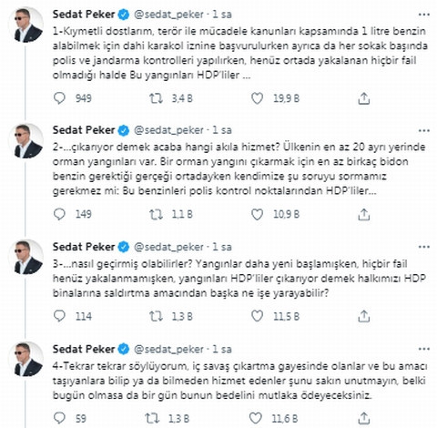 MedyaRadar’ın haberine göre Peker, “Bu yangınları HDP’liler çıkarıyor demek acaba hangi akıla hizmet? Ülkenin en az 20 ayrı yerinde orman yangınları var. Bir orman yangını çıkarmak için en az birkaç bidon benzin gerektiği gerçeği ortadayken kendimize şu soruyu sormamız gerekmez mi: Bu benzinleri polis kontrol noktalarından HDP’liler…nasıl geçirmiş olabilirler? Yangınlar daha yeni başlamışken, hiçbir fail henüz yakalanmamışken, yangınları HDP’liler çıkarıyor demek halkımızı HDP binalarına saldırtma amacından başka ne işe yarayabilir?” ifadelerini kullandı.