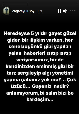 Çıkan haberleri yalanlayan Çağatay Ulusoy, “Neredeyse 5 yıldır gayet güzel giden bir ilişkim varken, her sene bugünkü gibi yapılan yalan haberleri ısıtıp ısıyıp veriyorsunuz, bir de kendinizden eminmiş gibi bir tarz sergileyip algı yönetimi çabanız yok mu?! Çok üzücü…Gayeniz nedir? Anlamıyorum bir salın bizi be kardeşim…” ifadelerini kullandı.