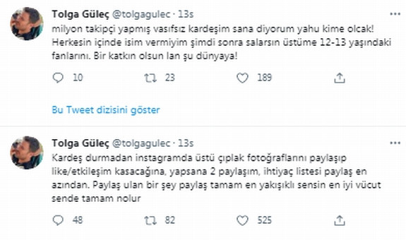 ‘Milyon takipçi yapmış vasıfsız kardeşim, sana diyorum yahu kime olacak! Herkesin içinde isim vermeyeyim şimdi, sonra salarsın üstüme 12-13 yaşındaki fanlarını. Bir katkın olsun şu dünyaya!