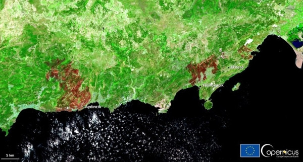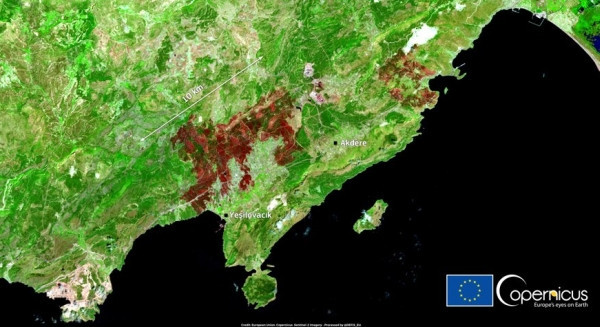 Sözcü Gazetesi’nin haberine göre Avrupa Birliği bünyesinde görüntü kaydeden Copernicus Sentinel-2 isimli uydu, Türkiye’de günlerdir söndürülemeyen ve çok sayıda yerleşim yerinin küle döndüğü ve 8 kişinin yaşamını yitirdiği yangının boyutunu ortaya koydu.
