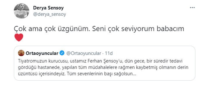Ortaoyuncular’ın Twitter paylaşımını alıntılayan Ferhan Şensoy’un kızı Derya Şensoy ise haberi doğrulayarak “Çok ama çok üzgünüm. Seni çok seviyorum babacım” mesajını paylaştı.