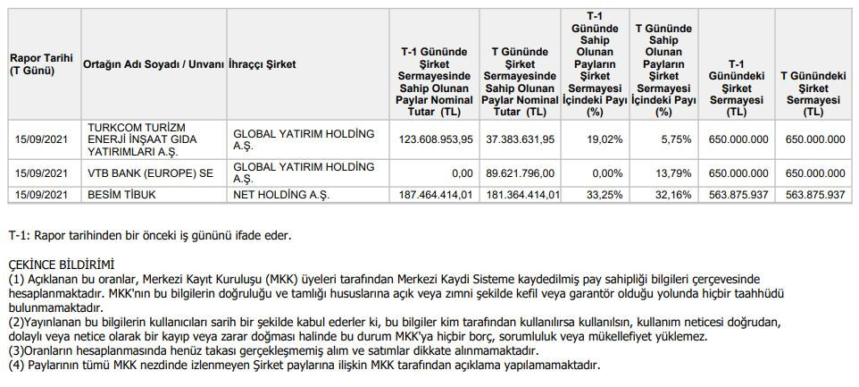BorsaGündem’in haberine göre Sermaye Piyasası Kurulu’nun Seri:II, No 15.1 Sayılı Özel Durumlar Tebliği’nin 12-(4). maddesi gereğince Global Yatırım Holding (#GLYHO) ve Net Holding’de (#NTHOL)  ortaklık yapısının değiştiği duyuruldu.