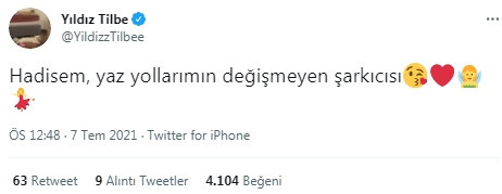 Tilbe paylaşımında, “Hadise’m, yaz yollarımın değişmeyen şarkıcısı.” ifadesine yer verdi.